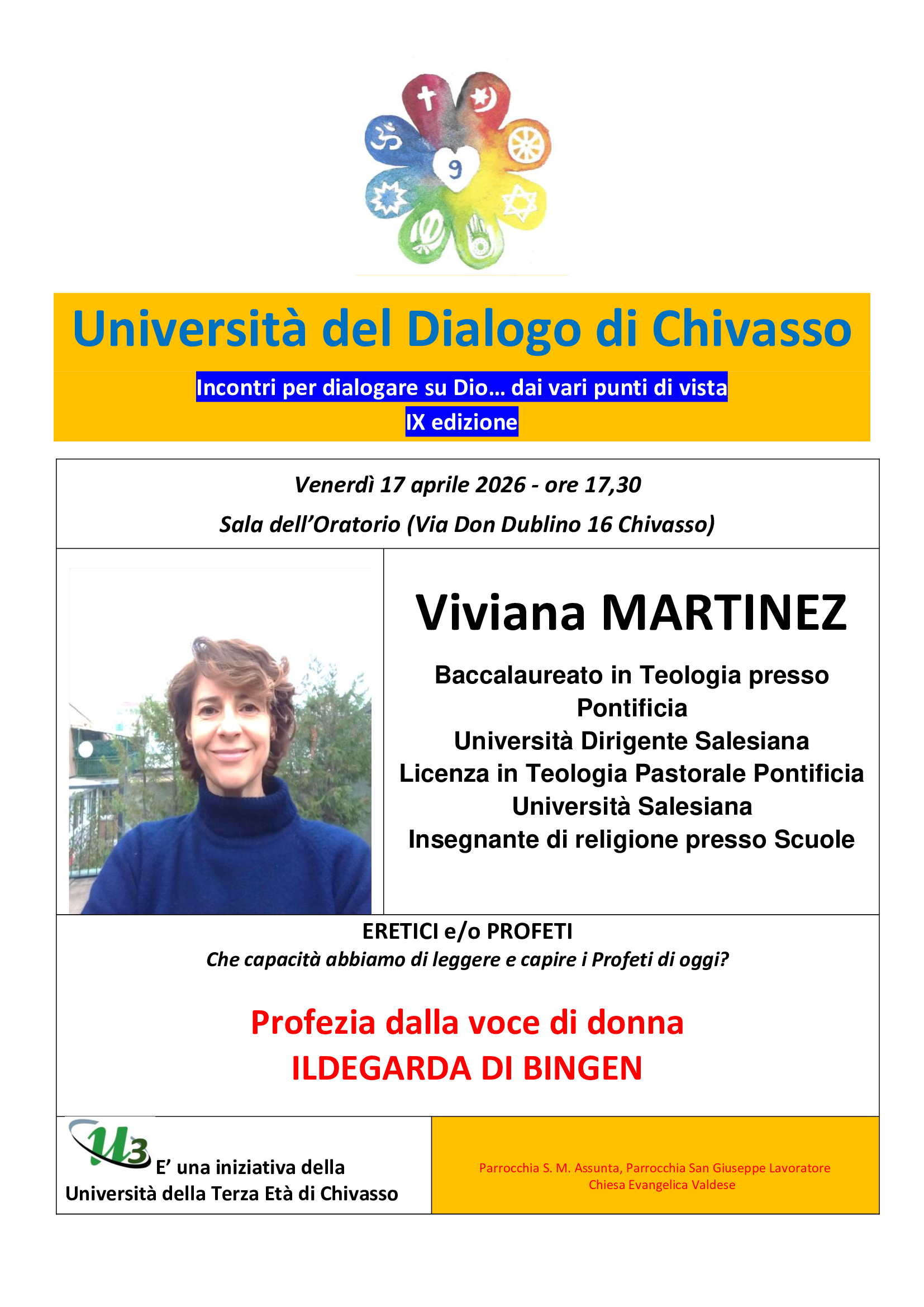 Venerdì 17 aprile alle ore 17,30 nella Sala dell’Oratorio di Chivasso, appuntamento dell’UNIVERSITA’ DEL DIALOGO conferenza con la dott.ssa Viviana MARTINEZ “dal titolo “Profezia dalla voce di donna: Ildegarda di Bingen”