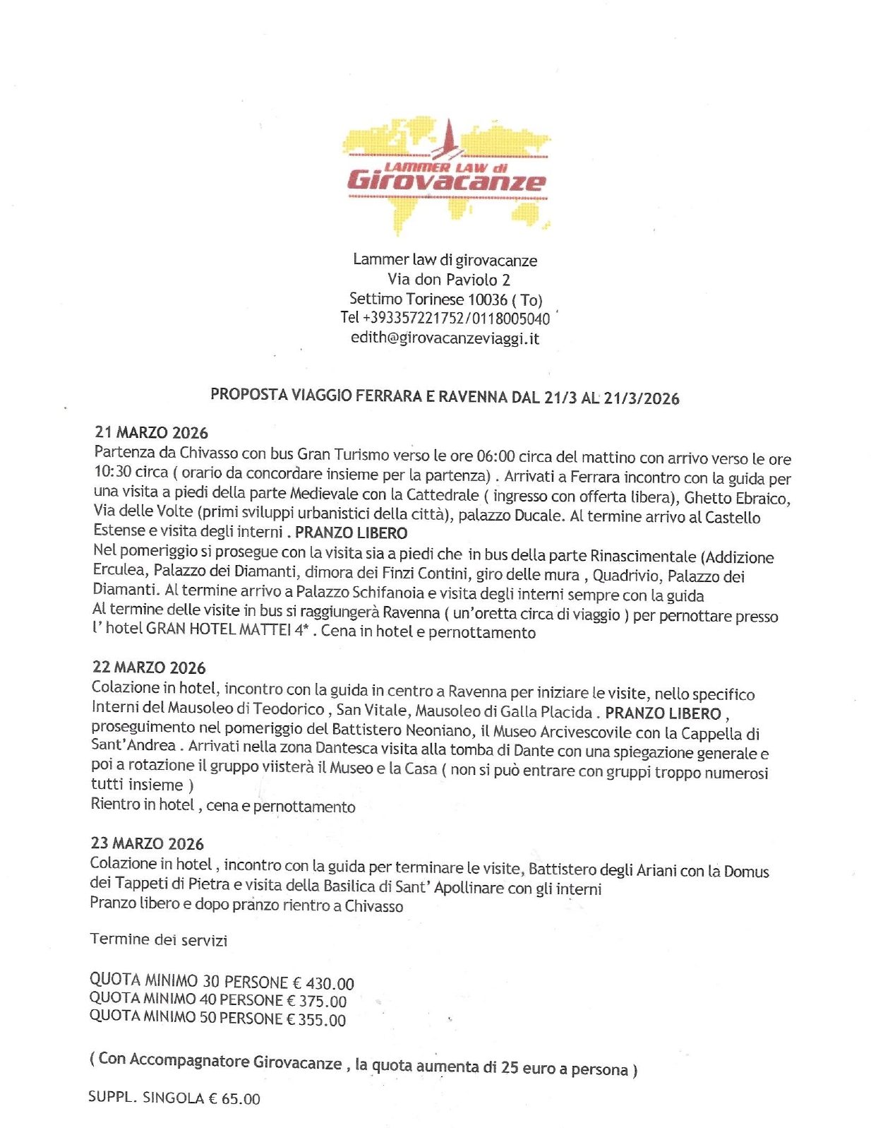 In allegato trovate la locandina per la visita alle Città di Ravenna e Ferrara per il prossimo 21 Marzo
