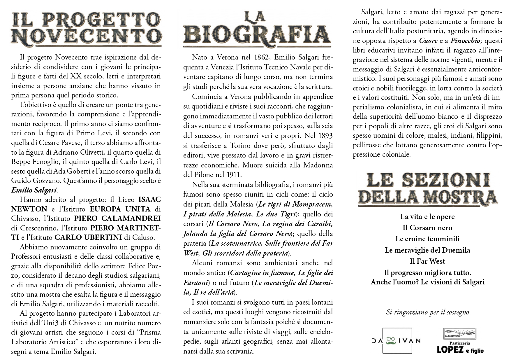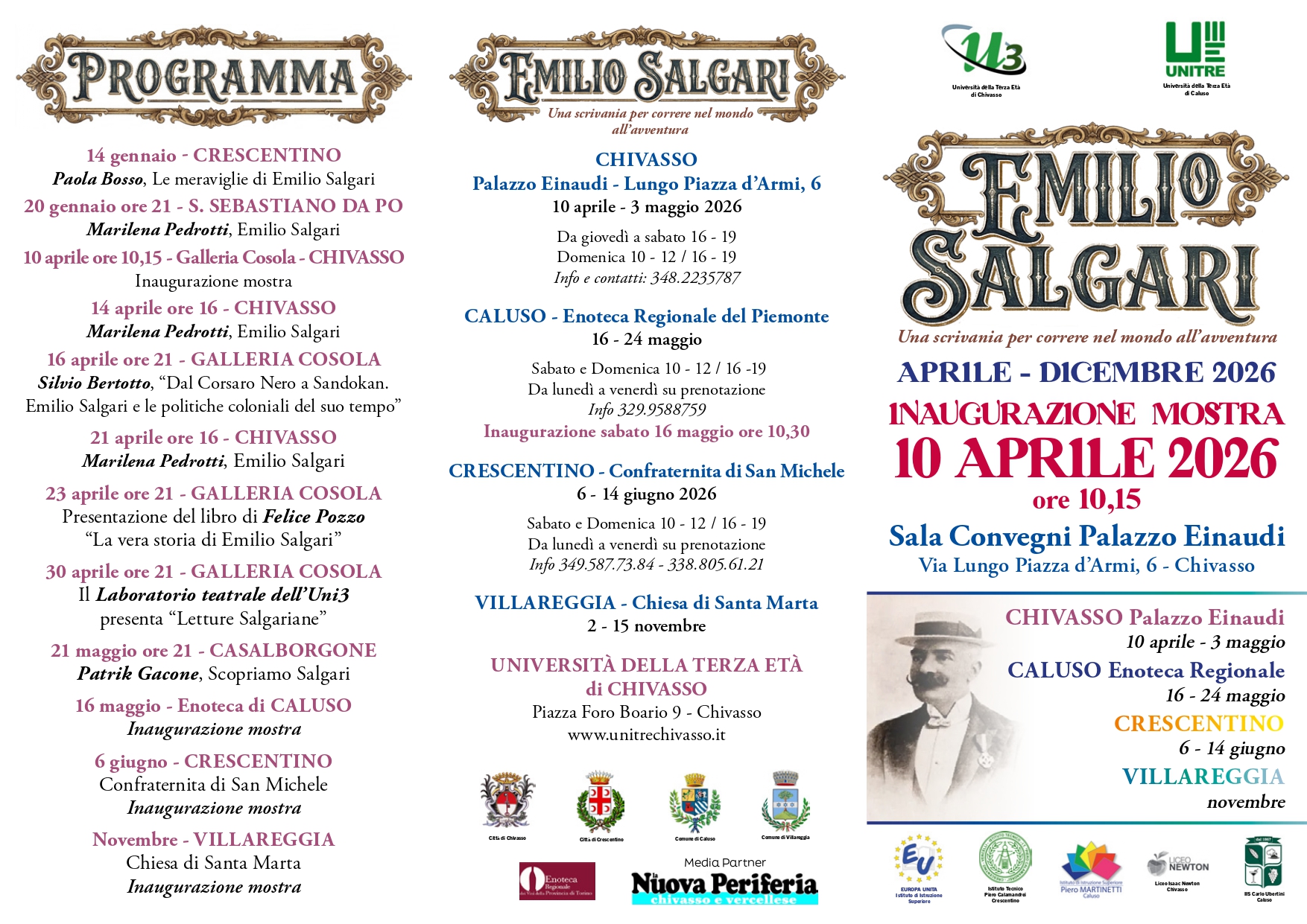 Anche quest’anno l’Università della Terza Età del chivassese e quella di Caluso propongono alle scuole lo studio di un personaggio della Storia del Novecento. Il personaggio scelto è Emilio Salgari, uno degli scrittori più letti e meno studiati, soprattutto dalle passate generazioni. La proposta è stata accolta con entusiasmo dall’Istituto Europa Unita di Chivasso, dal Liceo “Isaac Newton” di Chivasso, dall’Istituto “Calamandrei” di Crescentino, dall’Istituto “Pietro Martinetti” di Caluso e dall’Istituto “Carlo Ubertini” di Caluso. L’iniziativa dello studio del Novecento è ormai all’’ottavo anno: negli anni scorsi l’attenzione è stata puntata su Primo Levi, Cesare Pavese, Adriano Olivetti, Beppe Fenoglio, Carlo Levi, Ada Prospero Marchesini Gobetti e l’anno scorso su Guido Gozzano. La figura di Emilio Salgari è una figura con un ruolo importante nell’introdurre in Italia il genere letterario di avventura. Lo studio è stato condotto con la collaborazione del prof. Felice Pozzo saggista esperto della figura di Emilio Salgari e del Museo Mufant di Torino (organizzatore di una mostra su Sandokan): Materiali storici di proiezione sono stati forniti da RAI TECHE. Il progetto ha visto il concorso anche degli allievi dei Laboratori Artistici dell’Università della Terza Età che hanno collaborato con la realizzazione di opere artistiche e pitture aventi per tema i personaggi salgariani. Gli allievi del Laboratorio di Teatro partecipano con una serata di letture di alcune pagine tratte da libri dell’autore. Al progetto partecipa anche un nutrito numero di giovani artisti che seguono i corsi di “Prisma Laboratorio Artistico” e che esporranno i loro disegni a tema Emilio Salgari. Tutto il materiale raccolto, pannelli, fotografie e video, confluirà nella mostra che avrà come titolo “Emilio Salgari, una scrivania per correre nel mondo all’avventura” e che si terrà a Palazzo Einaudi in via Lungo Piazza d’Armi 6 in Chivasso dal 10 aprile al 3 maggio 2026. Successivamente verrà portata a Caluso presso l’Enoteca Regionale dal 16 al 24 maggio, a Crescentino presso la Confraternita di San Michele, dal 6 al 14 giugno 2026 e infine a Villareggia presso la Chiesa di Santa Marta nel mese di novembre prossimo. L’inaugurazione a Chivasso è prevista per venerdì 10 aprile 2026 dalle ore 10,15 nella Sala Conferenze di Palazzo Einaudi. La mostra, il cui ingresso è gratuito, si snoderà nei due piani della Galleria Cosola e sarà visitabile dal giovedì al sabato dalle 16 alle 19 e la domenica dalle 10 alle 12 e dalle 16 alle 19. I temi trattati saranno i seguenti: La vita e le opere, Il Corsaro nero, Le eroine femminili, Le meraviglie del Duemila, Il Far West, Il progresso migliora tutto, anche l’uomo? Le visioni di Salgari. Nel corso della mostra sono previsti alcuni momenti di approfondimento: il 16 aprile alle ore 21 a Palazzo Einaudi il prof. Silvio Bertotto terrà una lezione dal titolo: dal Corsaro Nero a Sandokan. Emilio Salgari e le politiche coloniali del suo tempo, il 23 aprile alle ore 21 a Palazzo Einaudi il prof. Felice Pozzo: presentazione del Libro “La vera Storia di Emilio Salgari” di Felice Pozzo e il 30 aprile alle ore 21 a Palazzo Einaudi – Letture salgariane, dialoghi e brani significativi tratte dai libri di Salgari, a cura degli allievi del Laboratorio di Teatro dell’Uni3 di Chivasso. Info e prenotazioni 348-2235787